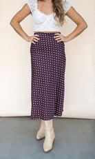 Add a touch of playful charm with the Chocolate Dot Satin Midi Skirt. Made from luxurious satin, its midi length offers a perfect balance of elegance and comfort. Whether you want to dress it up for a night out or keep it casual for daytime fun, this skirt makes styling effortless and exciting.