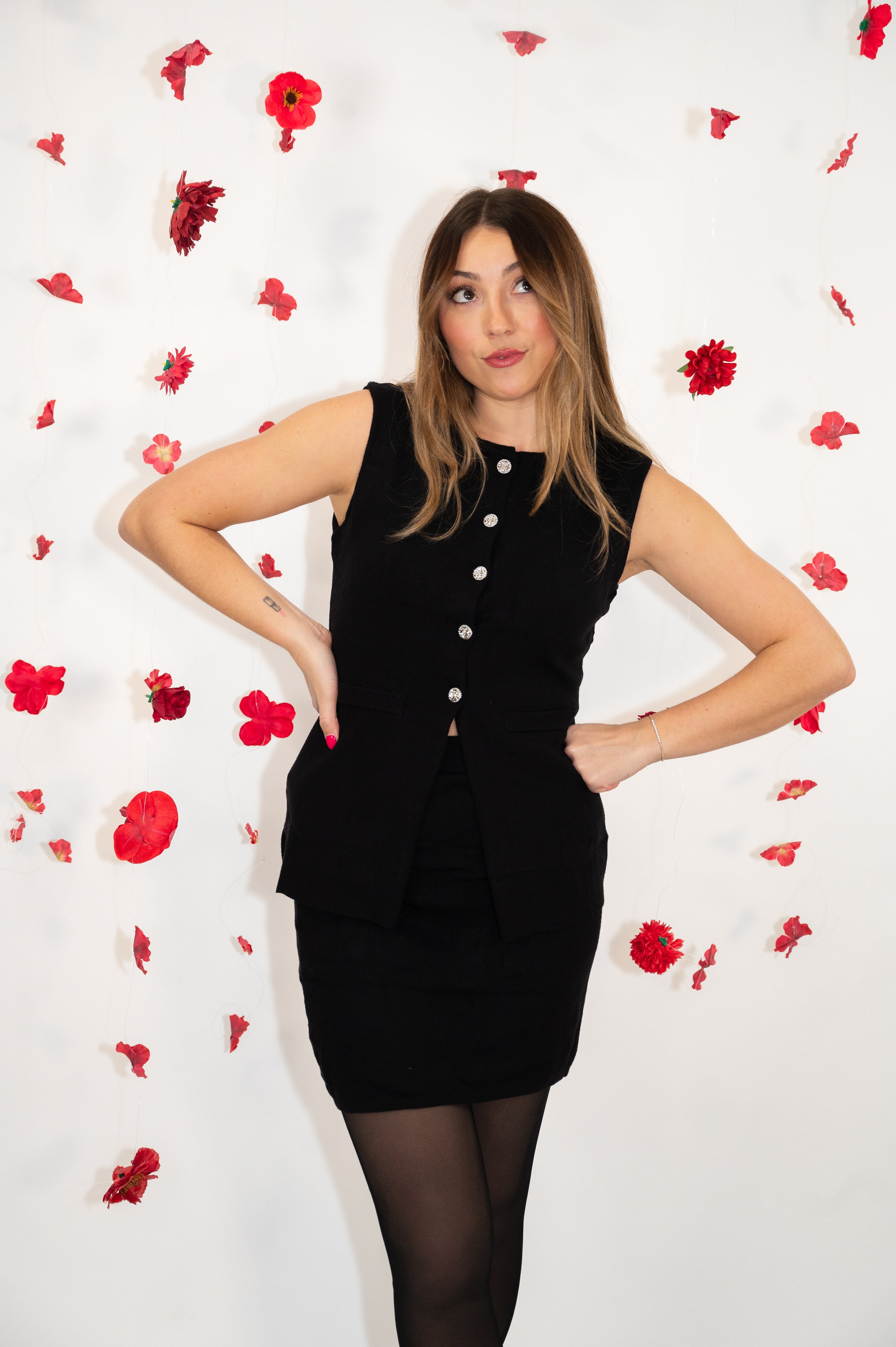 Make a statement with this power-packed two-piece set that's as versatile as you are. The sleeveless knit vest features a chic round neckline, silver-button front closure, and practical front pockets—perfect for adding polish to your look. Pair it with the matching black skort, complete with built-in shorts and a comfortable elastic waistband, for an effortless night-out ensemble. Love mixing and matching? Wear the vest solo to the office or style the skort with your favorite pieces for endless outfit possibilities.