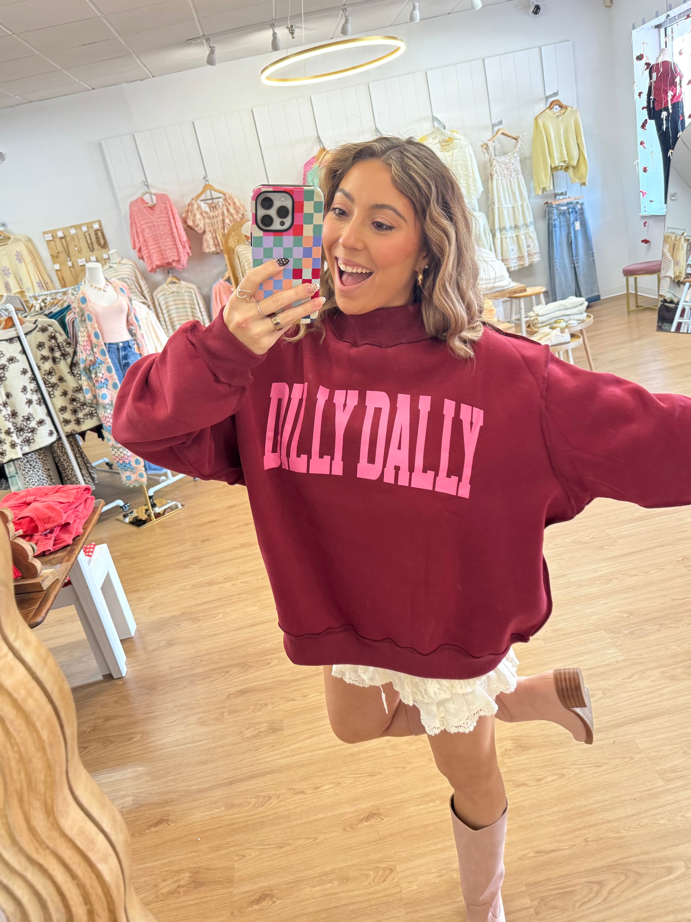 Rock this burgundy mockneck sweatshirt and let your vibe do the talking with its witty 'Dilly Dally' graphic. Ultra-plush and ridiculously comfortable, it's the kind of piece you'll reach for on repeat—no fuss, just grab and go. Whether you're procrastinating in style or embracing your laid-back mood, this sweatshirt pairs perfectly with your most relaxed days. Adorably quirky and undeniably cozy.