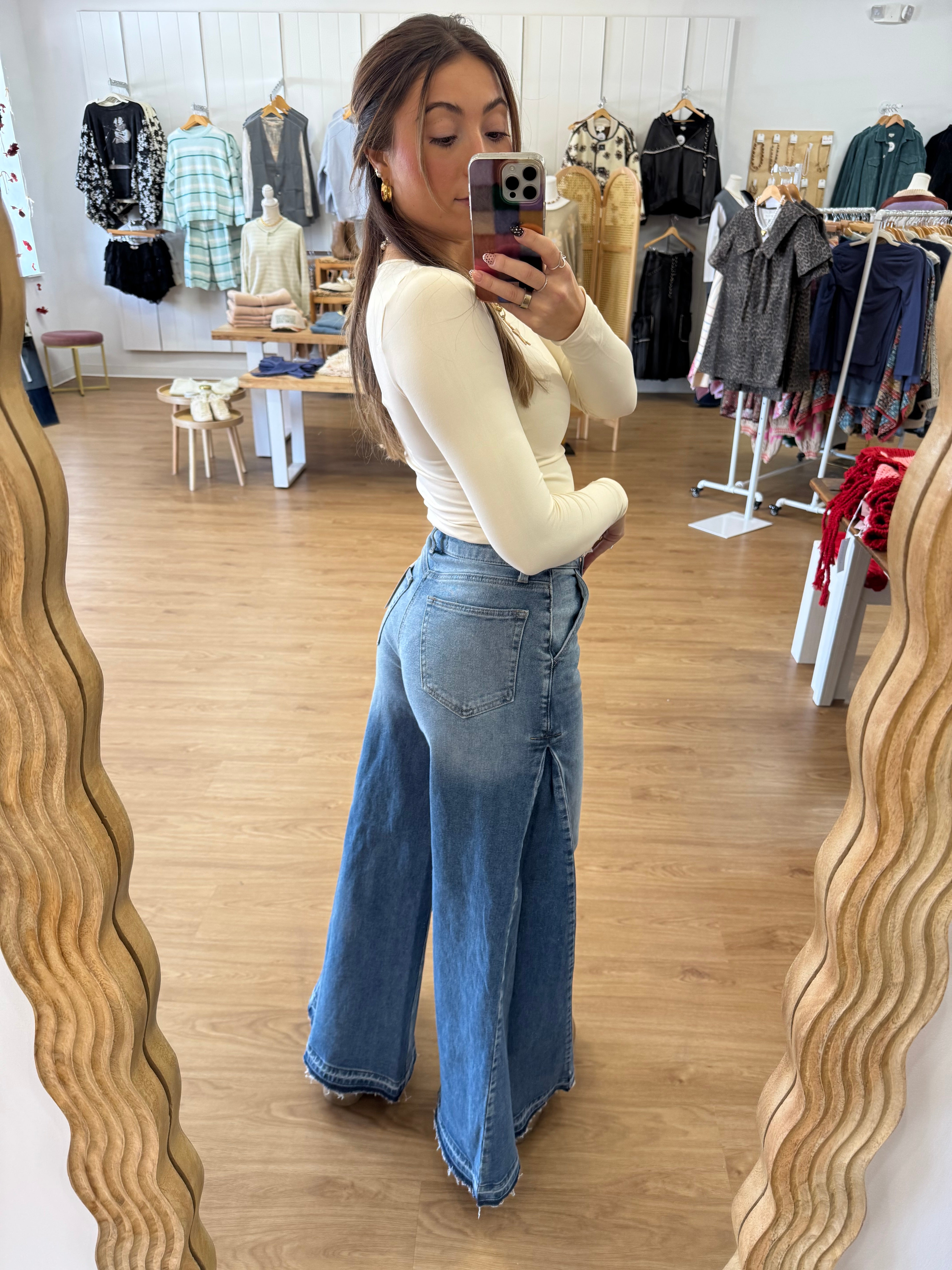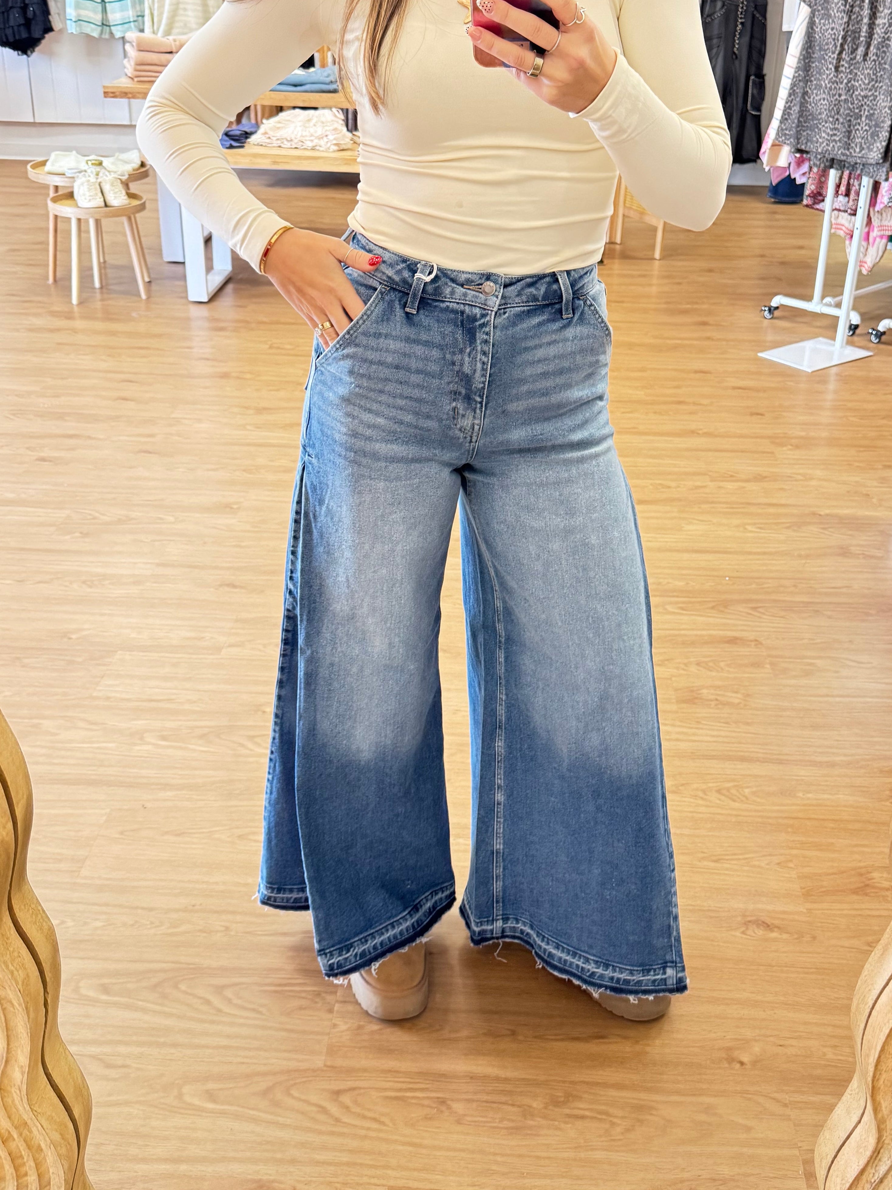 Elevate your denim game with these ultra-wide leg jeans featuring a flattering high-rise cut, chic side triangular tuck detail, and release hem. The medium wash pairs perfectly with everything in your closet, while functional belt loops and a smooth zipper fly keep things both stylish and practical. These jeans are the effortless upgrade your wardrobe has been waiting for.