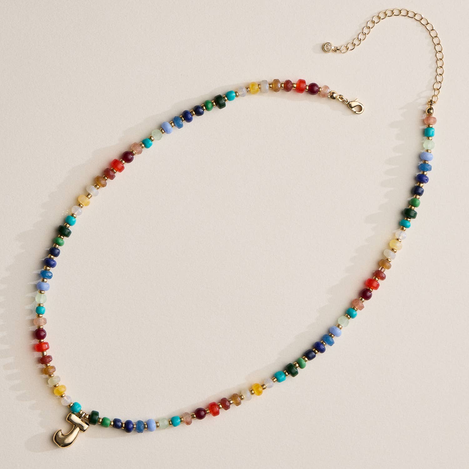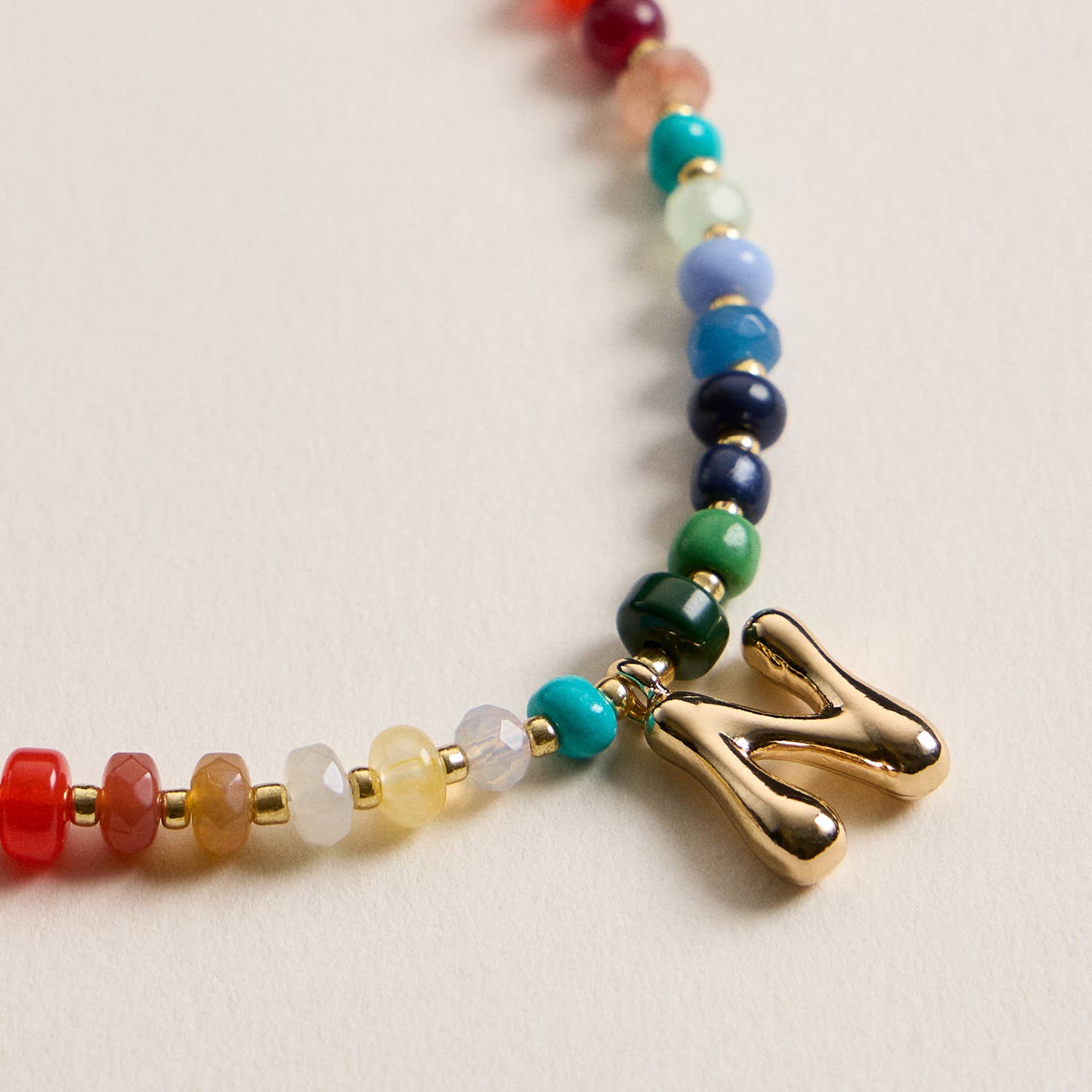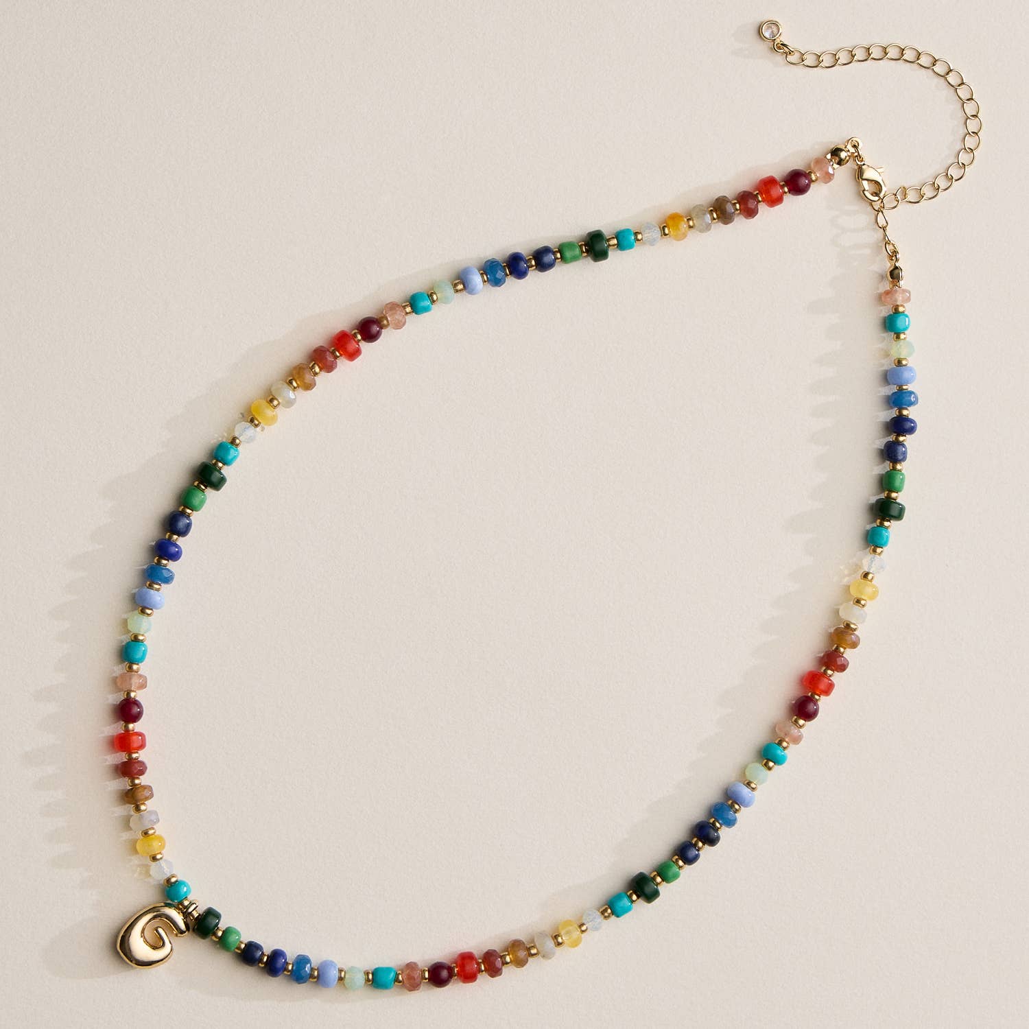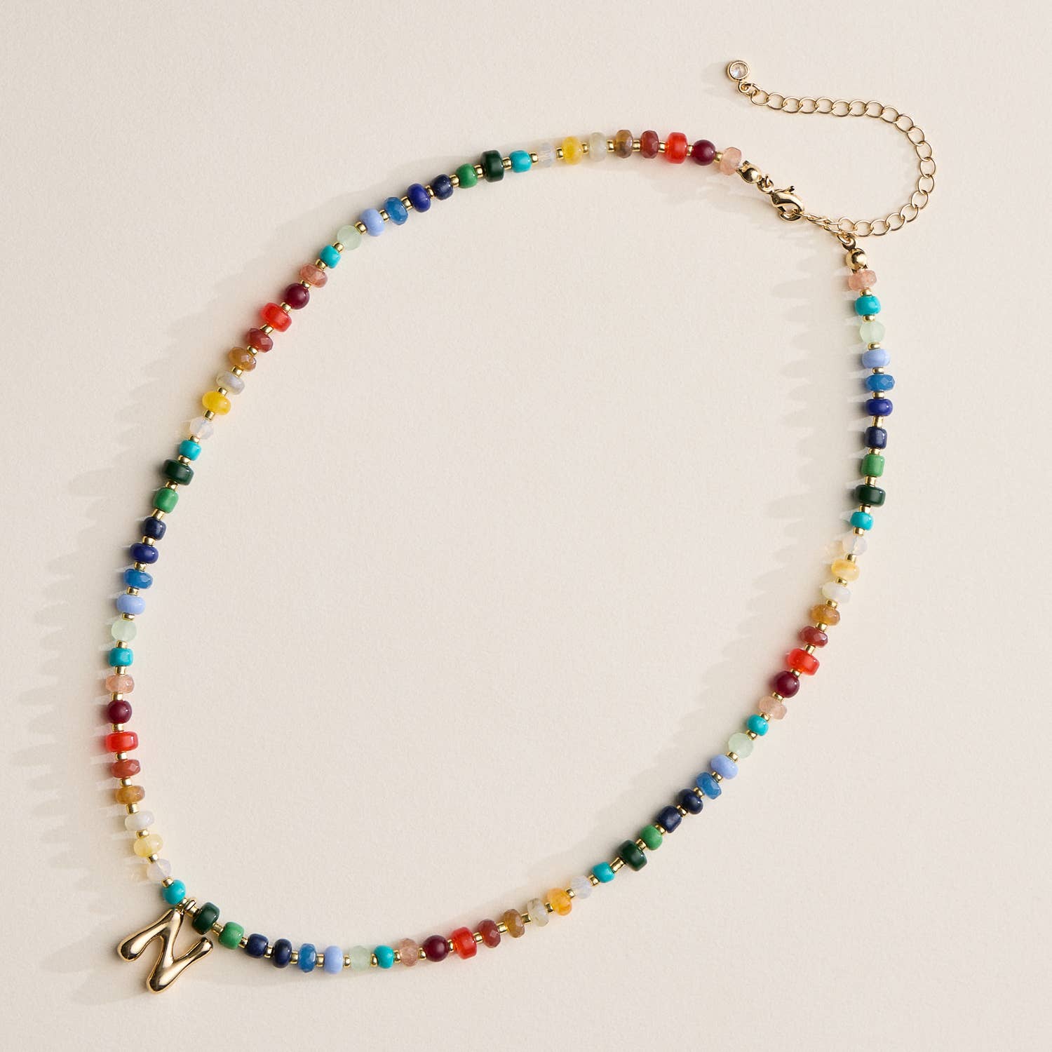 Add a personal touch to your jewelry collection with this colorful beaded necklace featuring a bold gold letter charm. Each necklace is crafted with vibrant glass beads in a rainbow of hues, creating a playful yet stylish look that stands out. The shiny gold charm adds a personalized element, making it a perfect gift or unique accessory for everyday wear.