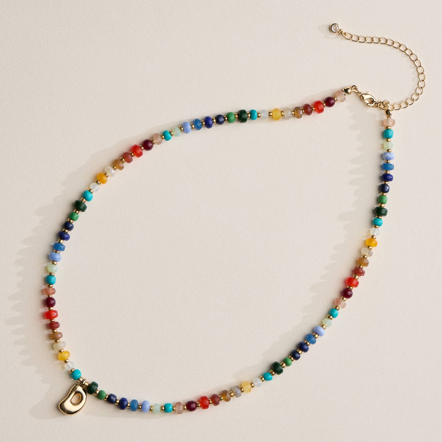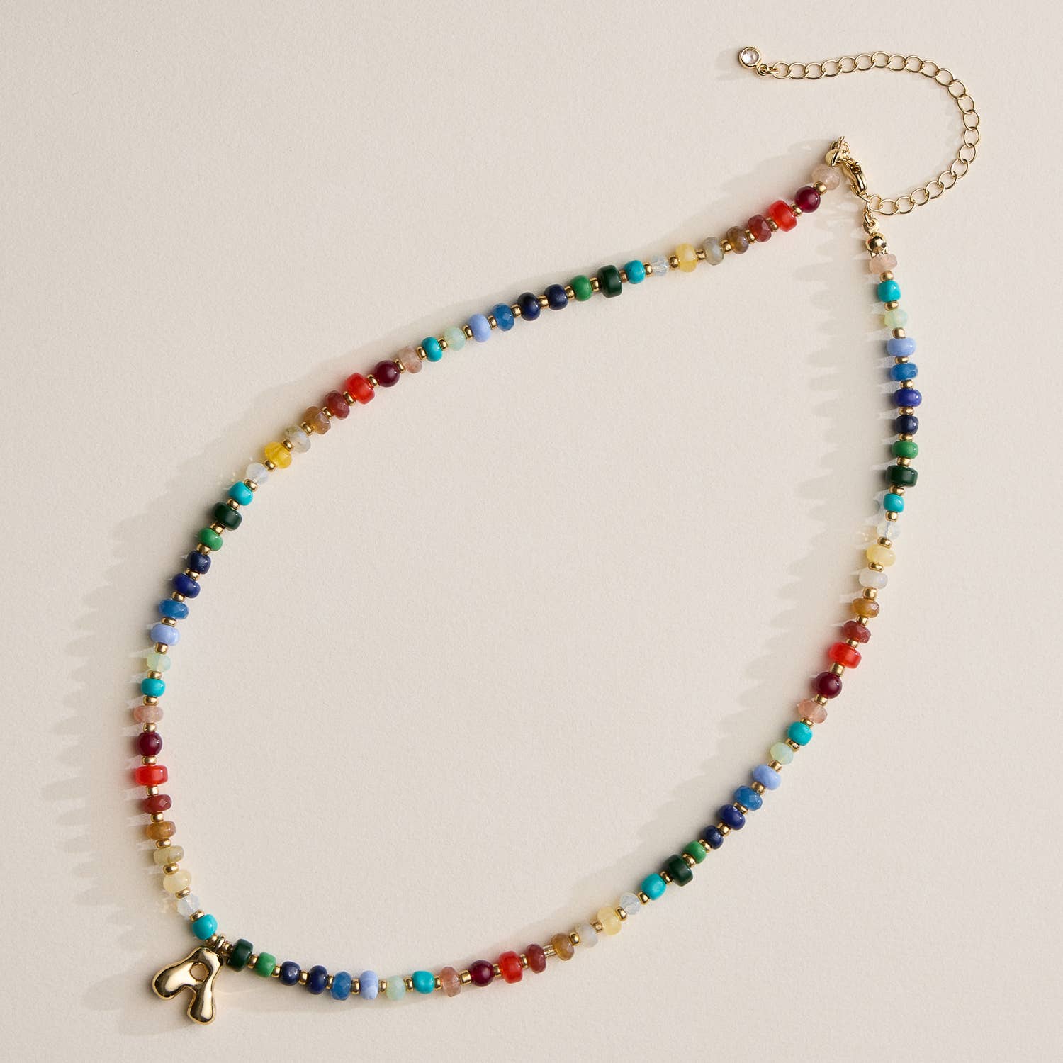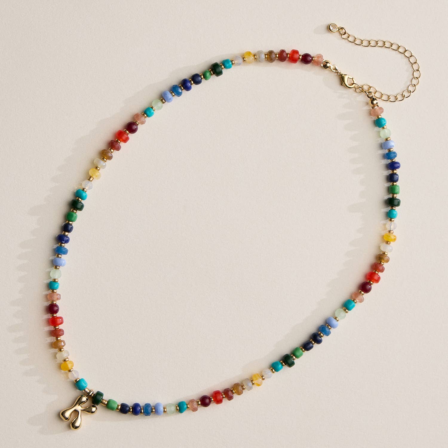 Add a personal touch to your jewelry collection with this colorful beaded necklace featuring a bold gold letter charm. Each necklace is crafted with vibrant glass beads in a rainbow of hues, creating a playful yet stylish look that stands out. The shiny gold charm adds a personalized element, making it a perfect gift or unique accessory for everyday wear.