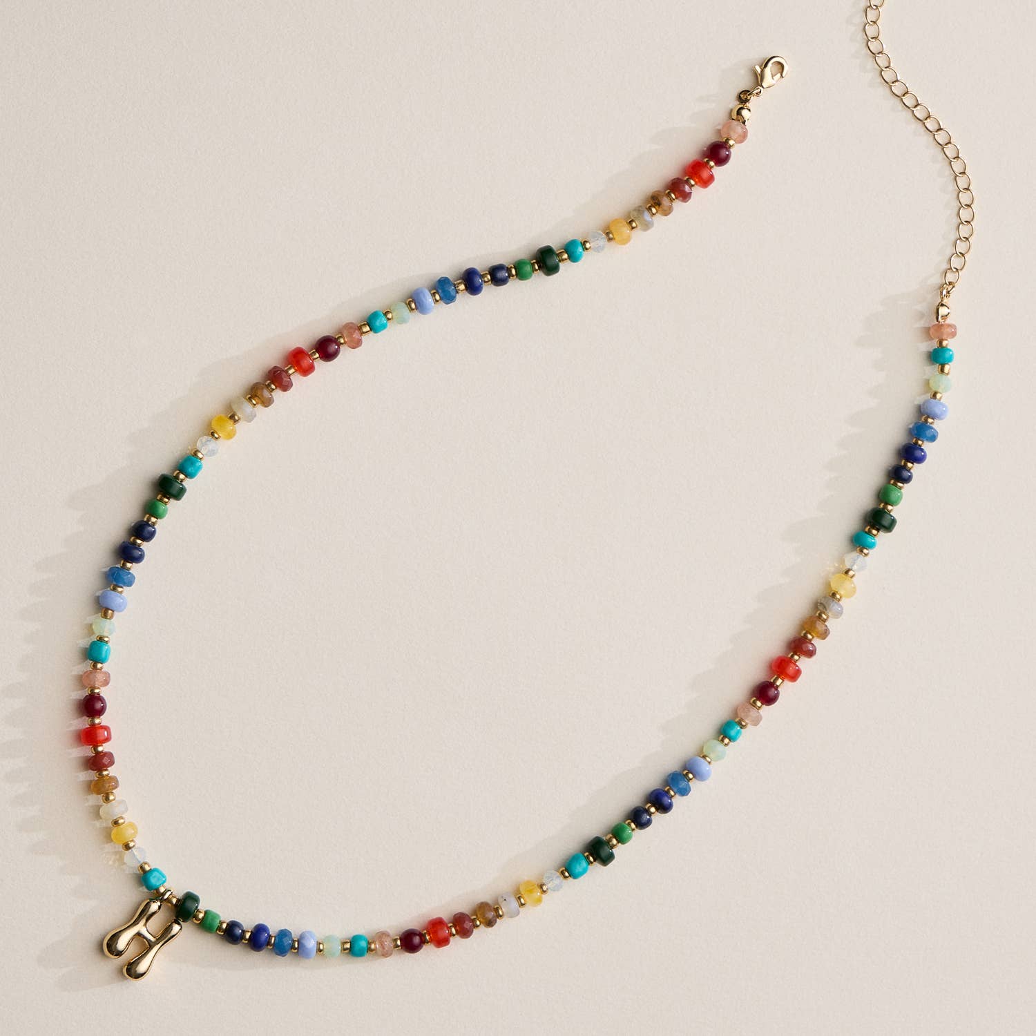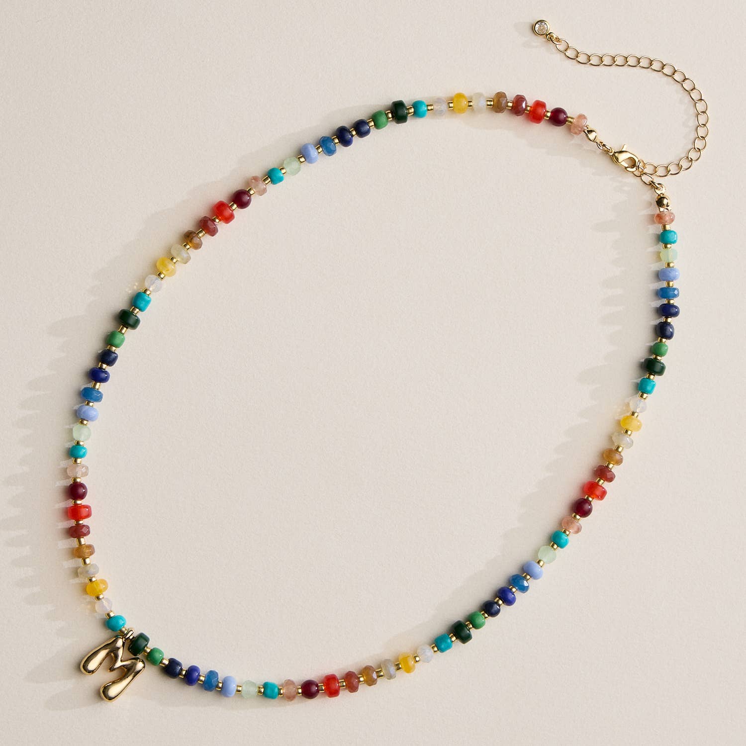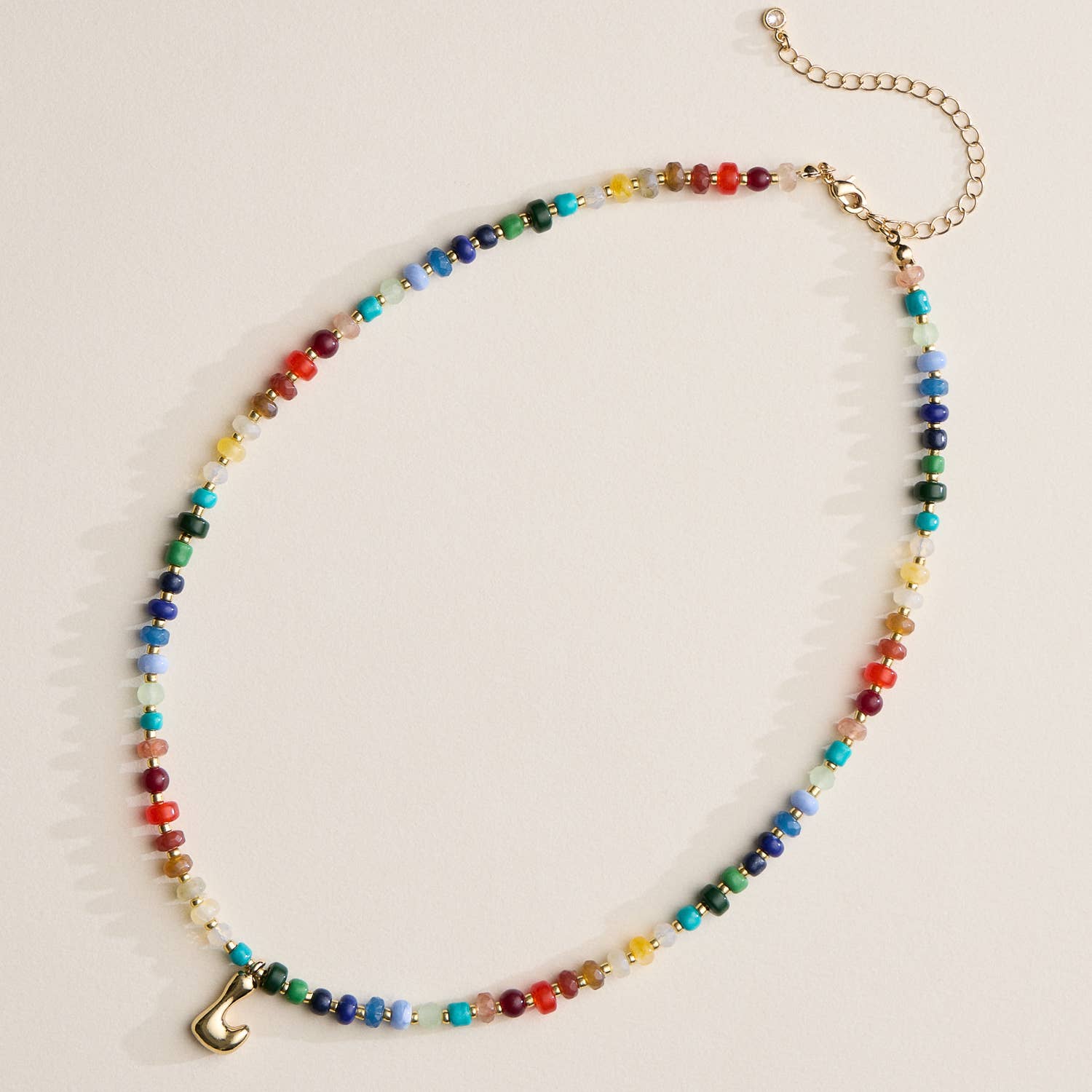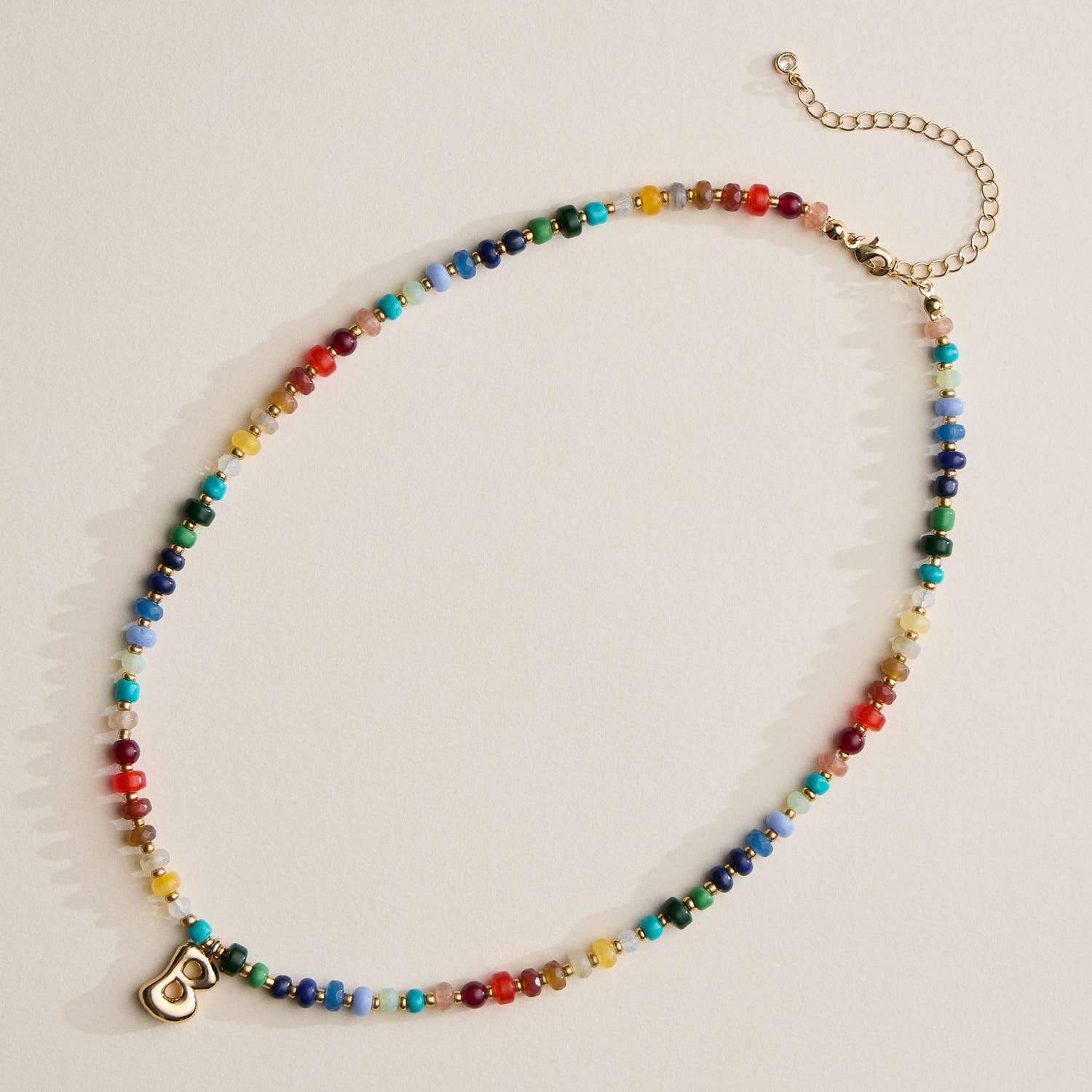 Add a personal touch to your jewelry collection with this colorful beaded necklace featuring a bold gold letter charm. Each necklace is crafted with vibrant glass beads in a rainbow of hues, creating a playful yet stylish look that stands out. The shiny gold charm adds a personalized element, making it a perfect gift or unique accessory for everyday wear.