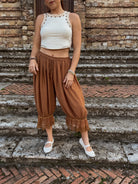 These charming cropped bloomer pants feature an elastic waist and intricate lace trim at the cuffs. The soft, breathable fabric blend offers comfort and style for a variety of casual occasions.