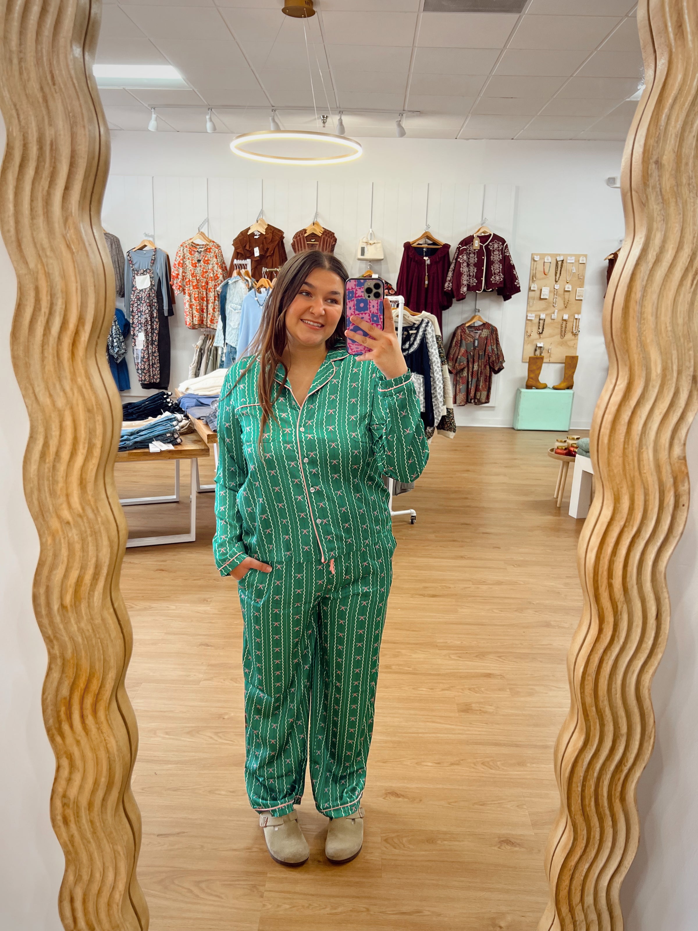 Get ready for the holiday cheer with the Charlotte In a Bow Christmas PJ. This playful set features silky satin fabric in a festive emerald green, accented with charming pink bows for a cute, feminine touch. The long sleeves and pants keep you cozy, making it perfect for comfortable lounging or joyful holiday mornings. Celebrate the season with style and spirit in this adorable pajama set designed to brighten your festive moments.