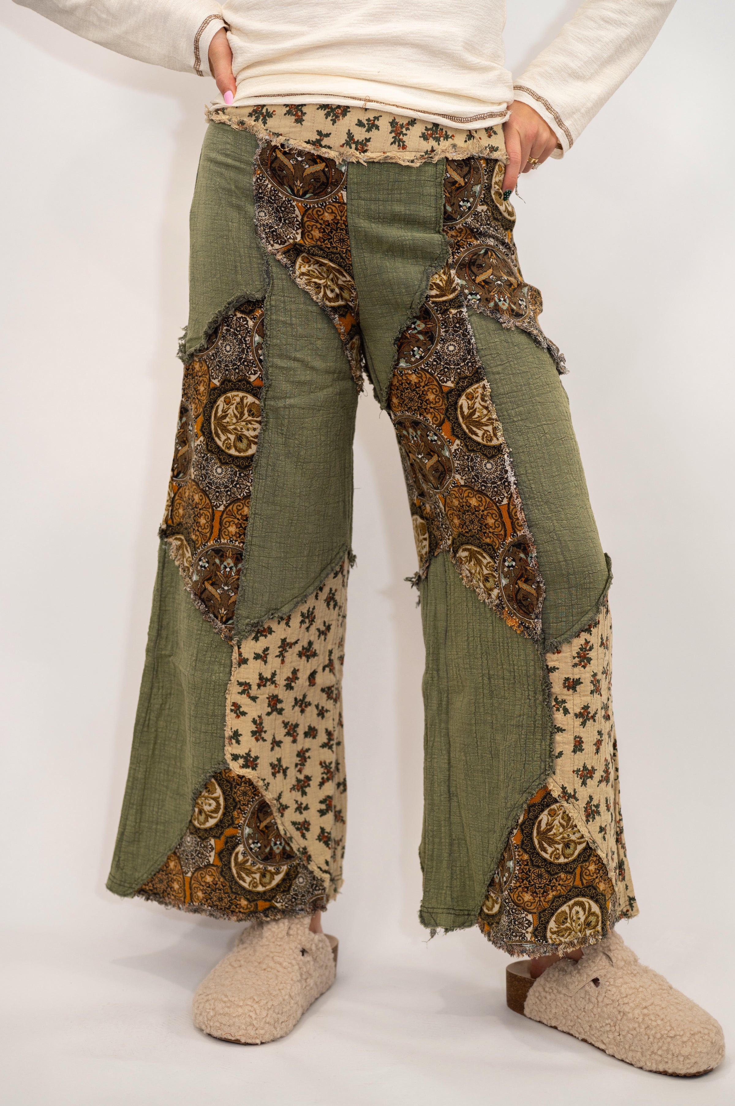 These olive pants blend boho vibes with everyday wearability, featuring a breezy wide-leg cut in soft double gauze. The patchwork of mixed floral and paisley prints adds personality to every step, while the side zipper keeps things practical. Cute, comfy, and ready for whatever adventure calls.