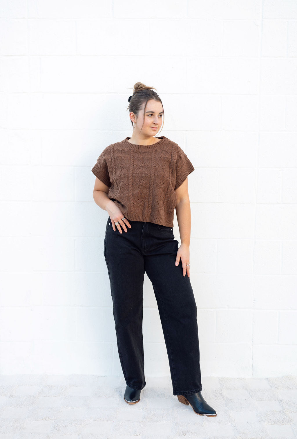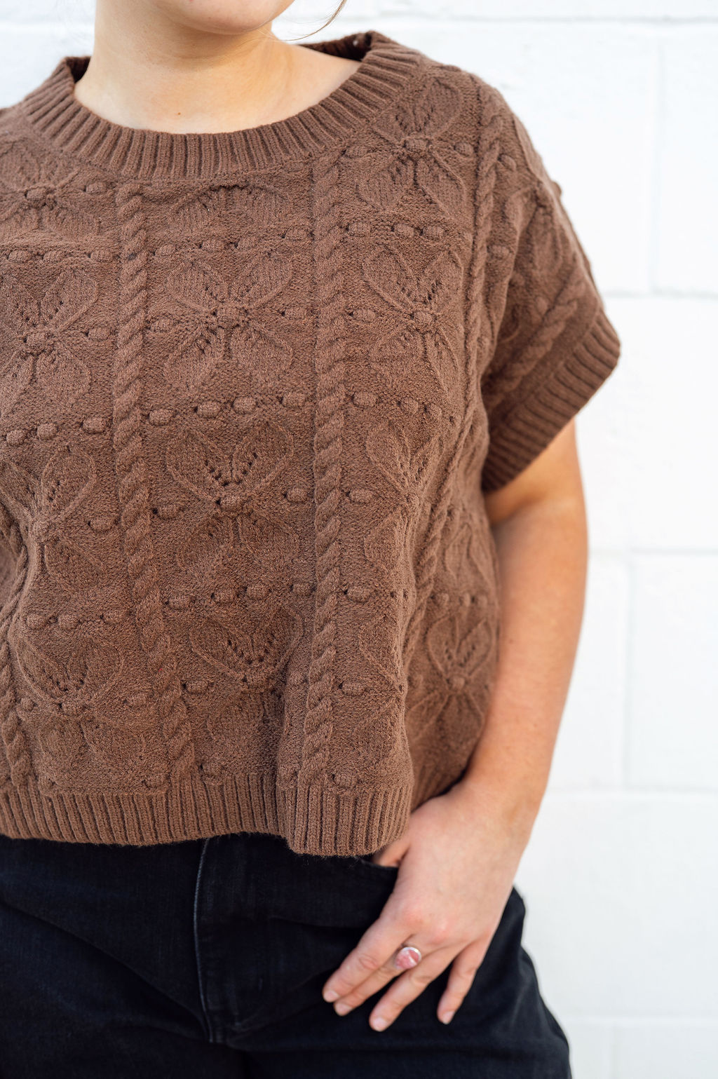 Add a touch of charm to your outfit with the Walnut Blossom Knit Vest. This playful knit sweater vest features a delicate flower pattern and short sleeves, perfect for layering over your favorite tops or on its own. Its cute design brings a fresh vibe to any look while keeping you cozy and stylish. Great for mixing and matching, this vest is your new go-to piece for effortless, fun fashion.