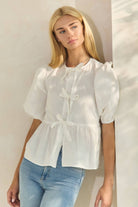 This charming blouse brings effortless style with its crisp cotton poplin fabric and playful front tie ribbon detail. The short puffed sleeves add a touch of whimsy, while the peplum silhouette flatters with feminine flair. Perfect for creating coordinated looks with the little ones in your life, it's the ideal piece for anyone who loves dainty, feel-good fashion.